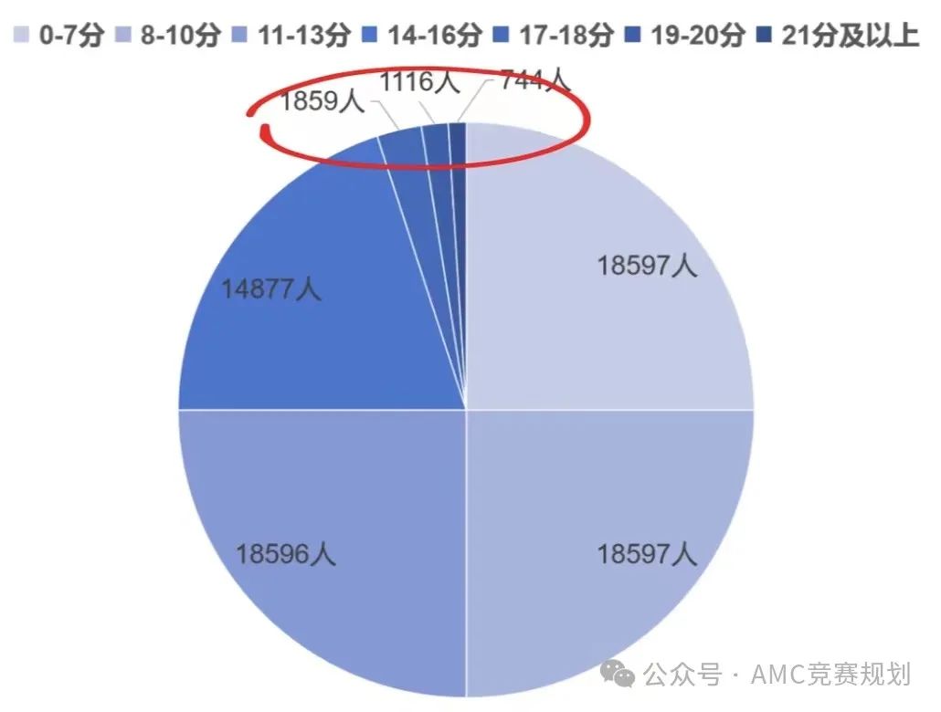 2023年AMC8的参赛人数共74386人,数据非常庞大,已经超越了AMC10+AMC12的参赛总人数。在2023年AMC8赛事中,前1%的分数线为21分,前5%分数线为17分,能够拿到奖项的仅约有3720人,竞争十分激烈。
