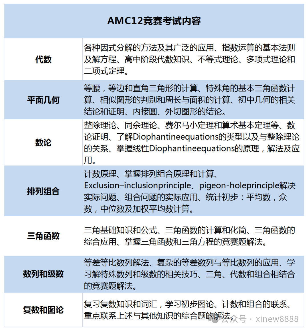AMC12竞赛考察内容相对比较广,基本包含代数、几何、数论、组合几个模块的内容。