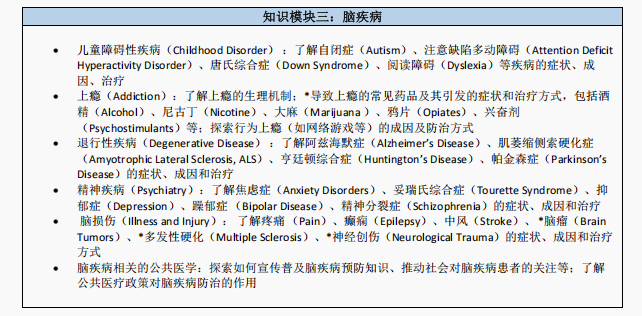 考试围绕与大脑相关的基础知识,鼓励学生探究式学习,考察的内容主要包括大脑结构、大脑功能、大脑疾病等。同时,官方还提供了考试大纲供同学们参考。