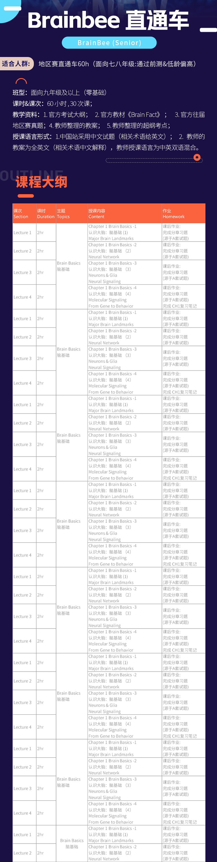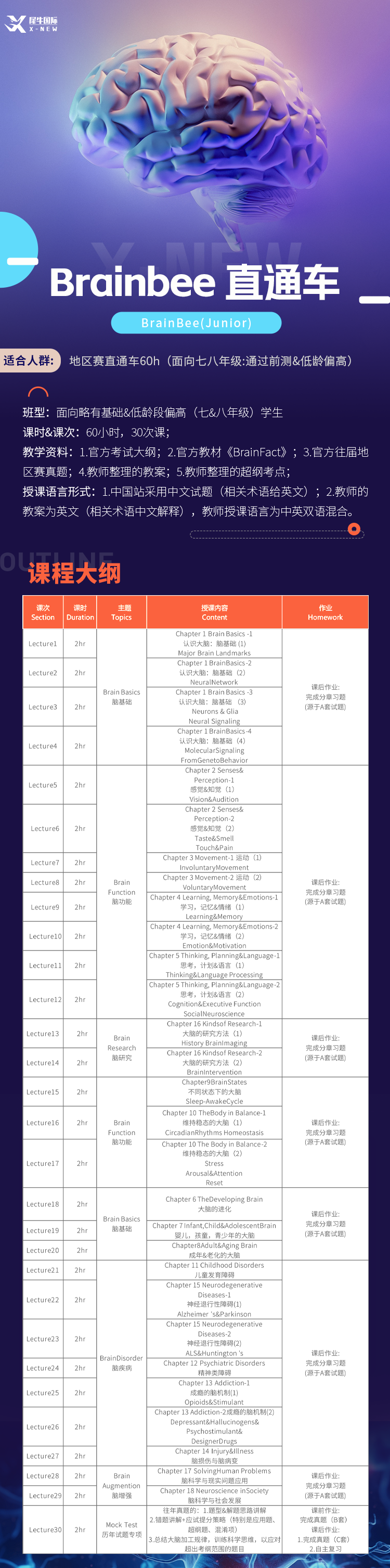犀牛针对Brain Bee脑科学大赛开设有专门的培训课程,专业师资团队授课,专业辅导教材,帮助同学们深入学习,冲分拿奖!
