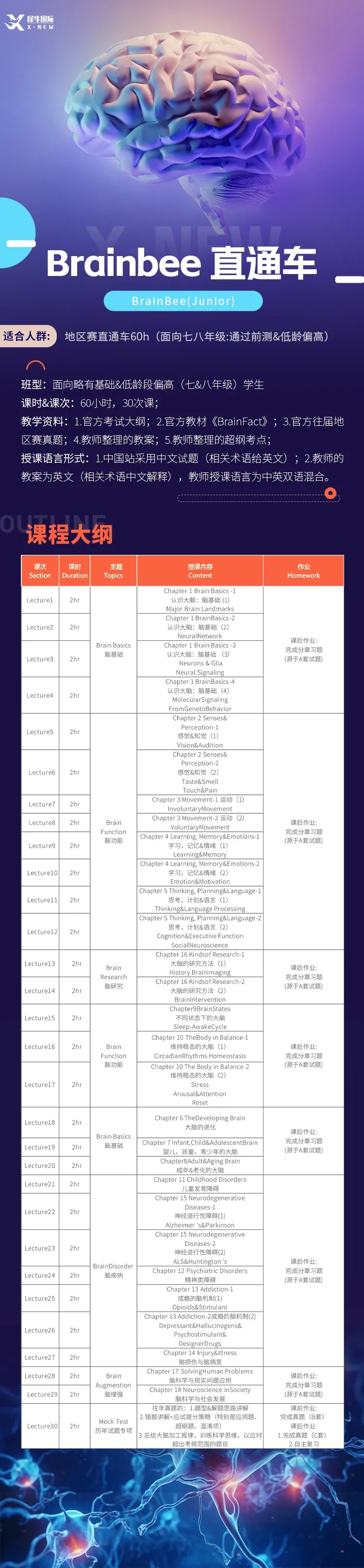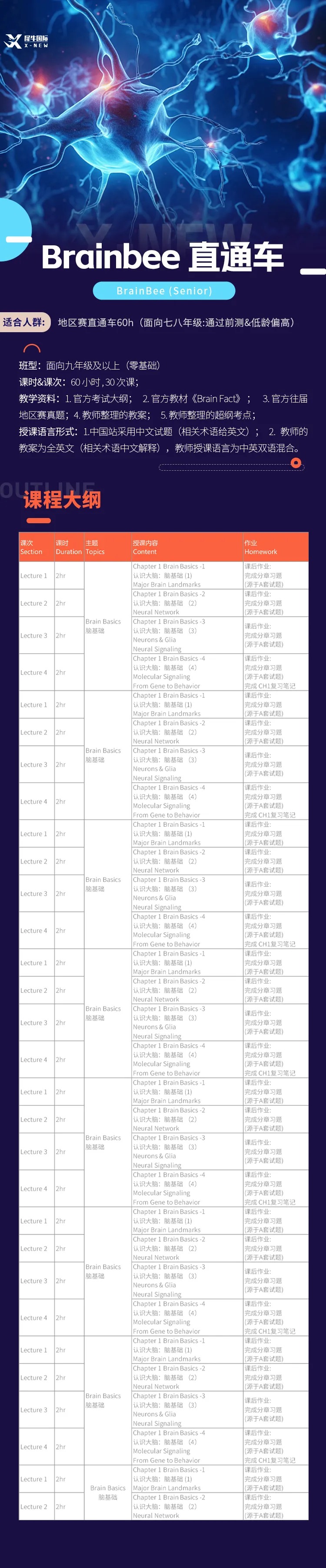 针对目前正在备考brainbee脑科学大赛的同学,犀牛教育设置了60小时直通车和20小时冲刺课三种班型,以官方推荐教材《brain facts》为教辅材料,搭配专业老师根据历年真题整理的核心内容,帮助学员顺利晋级国赛!晋级国赛之后还有专门的brainbee国赛冲刺课助你一臂之力!需要课程辅导可以右下角找客服 xnew686 在线咨询哦!
