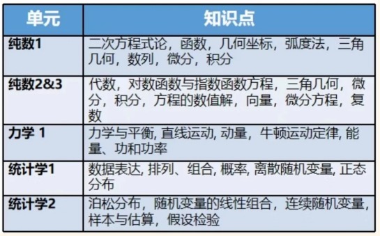 (一)A-level数学学什么? 1、A-Level数学,分为基础数学(Math)和进阶数学(Further Math),是独立的两个A-Level科目, 一般需要先学完基础数学,才能学进阶数学,在选科时可以单独只选择基础数学。 2、A-Level数学的内容有四大模块:纯数学(puremathematics)、统计数学(statistics)、 机械数学(mechanics)、 决策数学(decision mathematics). 3、纯数部分分为了三本书:纯数1,2,3(简称P1,P2,P3);力学分为1,2(简称M1,M2), 主要学习数学在物理中的应用;统计学分为统计学1,2(简称S1,s2);在进阶数学的内容 中还是这三个板块,只不过进阶数学是高等纯数1、2(简称FP1,FP2),高等力学1(简称FM1), 高等统计学1(简称FS1)。
