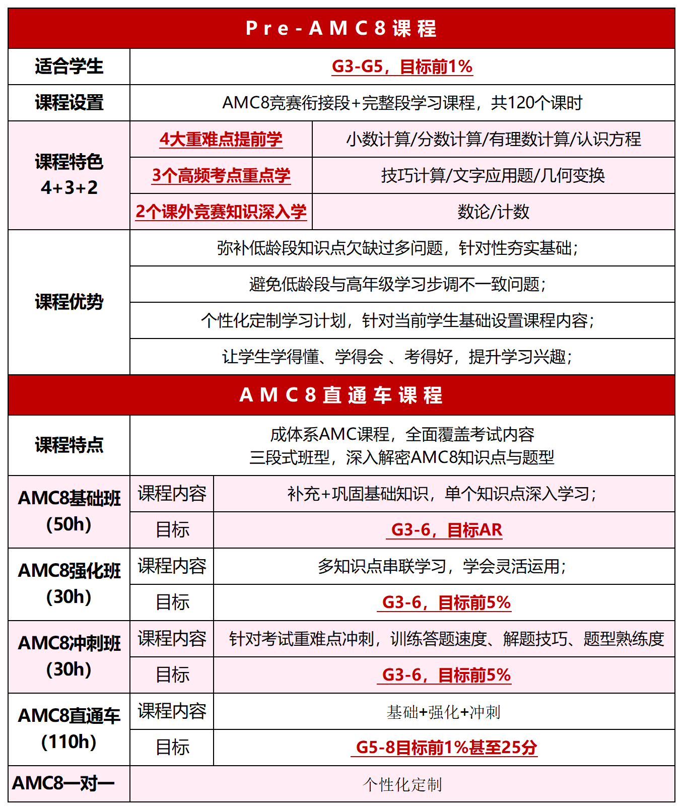 适合学员:G3-G4,基础薄弱或初次接触AMC8,想要长线备考AMC8的学生