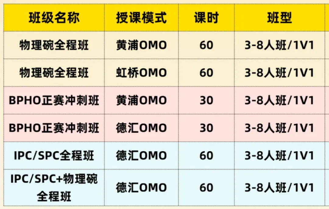 • 体制内:初中物理60小时+CPhO衔接班40小时+CPhO基础班80小时+CPhO进阶班40小时