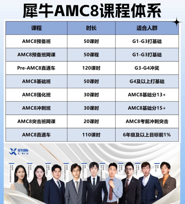 犀牛为准备AMC8数学竞赛的同学推出AMC8寒假培训课程,名校师资背景,熟悉AMC8的出题规律和命题方向,深谙AMC8提分方法 ,能够精准定位学员薄弱点,制定学习计划,高效提分。