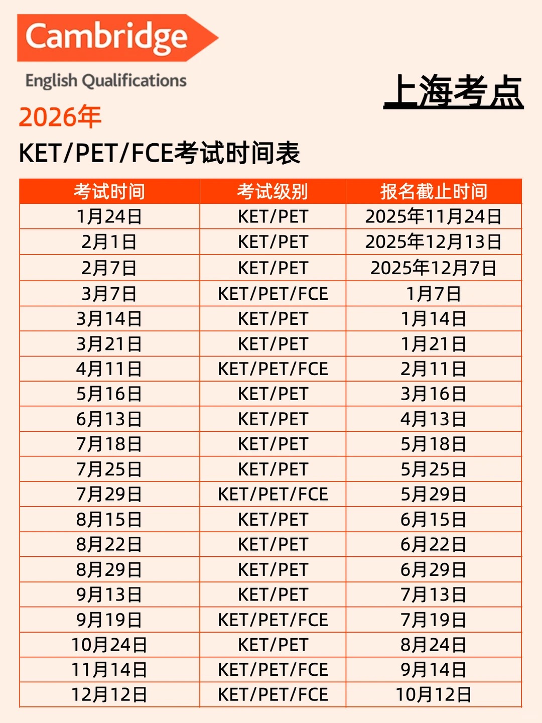 2026年上海KET考试时间已出,很多家长不知道KET考试在哪报名?今天橙子带大家看看上海KET考试时间表,KET考试详细报名流程给到大家,文末也有KET考试培训课程,上海浦东、徐汇、黄浦、闵行4地线下上课。