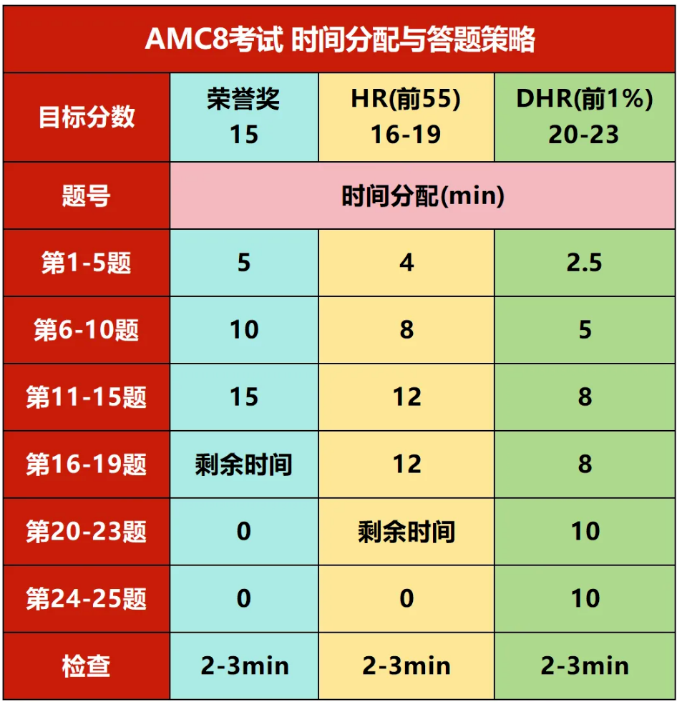 AMC8竞赛总共25道题,全部为选择题,AMC8竞赛题目分布有一定规律,把握题目分布规律,做题更有节奏感,不同难度题目所需时间和答题方法不同,AMC8竞赛不同目标分学生应该采取不同备考策略!