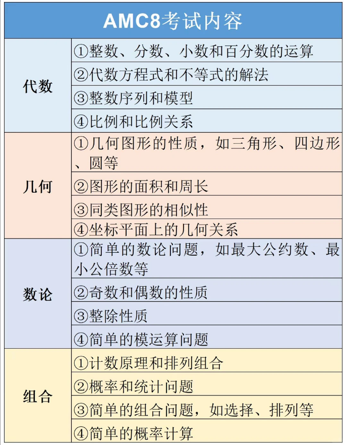 AMC8考试内容覆盖小学至初中数学知识,主要分为代数、几何、数论以及组合四大模块: