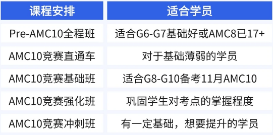 上海犀牛除了优秀的授课老师之外,还有非常完善的AMC10课程培训体系,任何基础、任何年级都有合适的班型可以选择!
