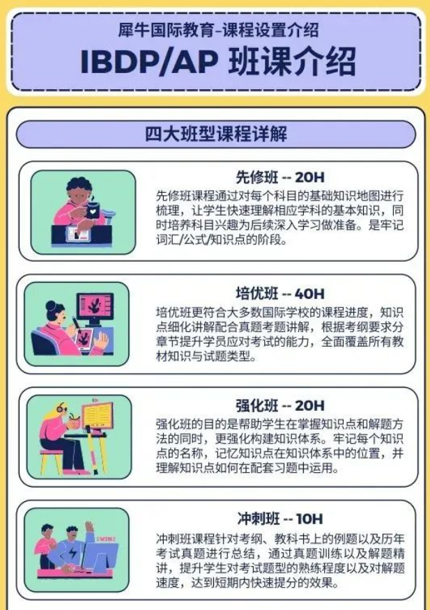 课程定位:美国大学理事会推出的大学先修课程,旨在让学生提前接触大学课程,为美本申请加分,不属于完整课程体系,需搭配其他课程(如美高课程)使用。