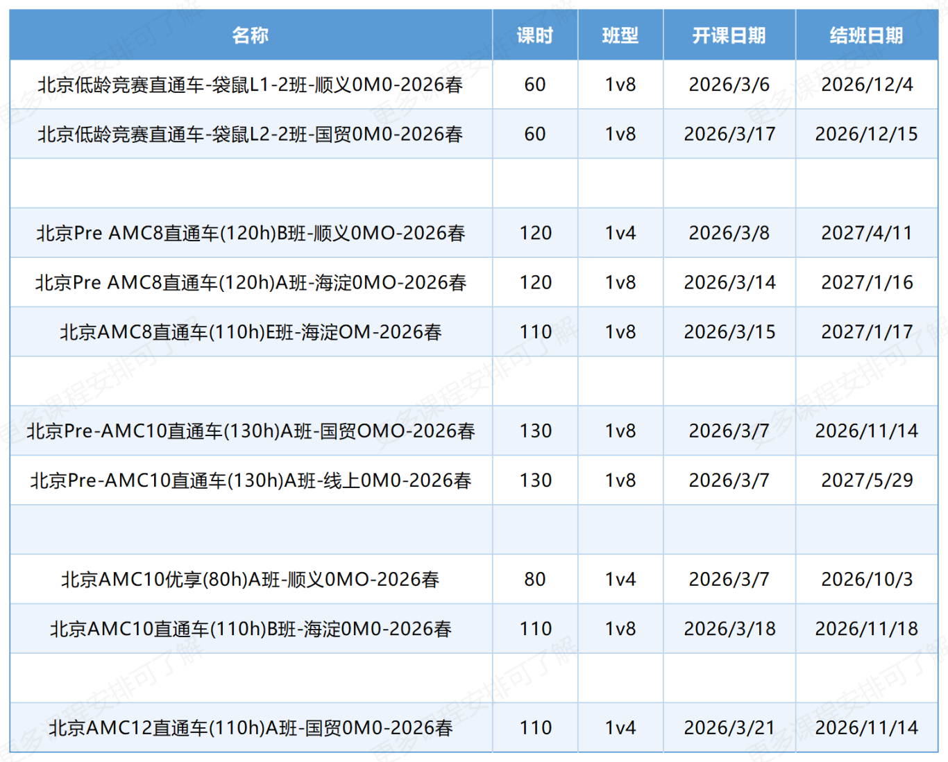 在本次AMC数学竞赛培训春季班的安排中,北京海淀,国贸,顺义均有新班开设,我们以近期开设的部门AMC培训课程安排为例,同学们可参考下: