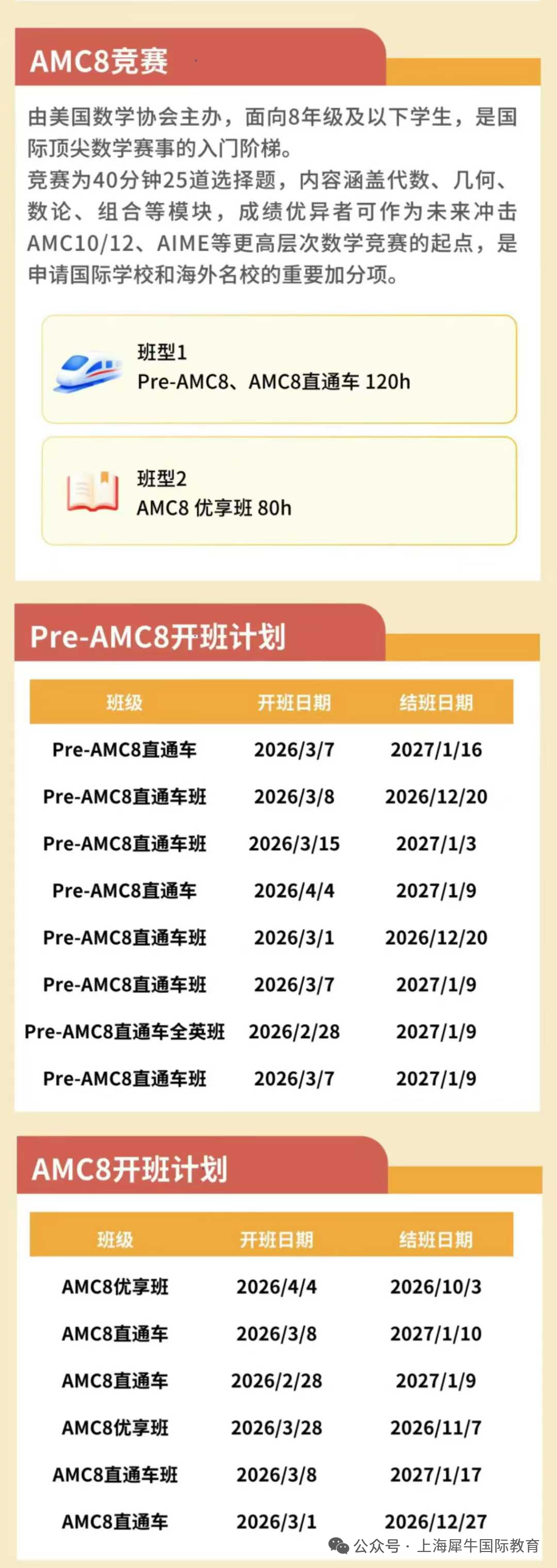 犀牛为AMC8考生推出AMC8培训课程,线上线下均可上课,可就近选择校区上课,也可选择AMC8线上课程。开班时间段较多,可根据孩子基础匹配合适的班级。具体课程费用,开班时间段可点击客服咨询。