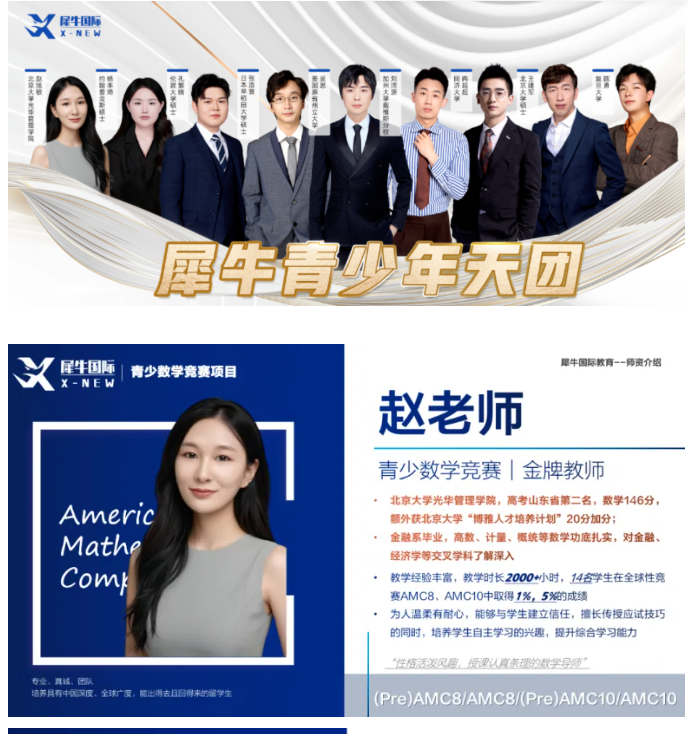 上海犀牛浦东校区AMC8竞赛核心导师均毕业于北京大学、清华大学、复旦大学、麻省理工学院、伦敦大学学院等国内外顶尖院校,多数自身曾斩获AMC、AIME等国际竞赛高分,懂竞赛、更懂如何教孩子拿高分~