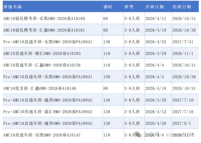 2026年犀牛AMC10竞赛长线系统备考班已经开始,犀牛AMC10全程班110小时包括基础+强化+冲刺一站式备考,犀牛金牌名师带你冲AMC10前1%!犀牛针对不同基础备考AMC10竞赛的同学,开设多种班型课程,不清楚孩子目前水平适合的班型?犀牛提供专业水平测试卷,由资深规划老师一对一诊断,精准匹配最适合的AMC10数学竞赛培训课程班级和备考路径!