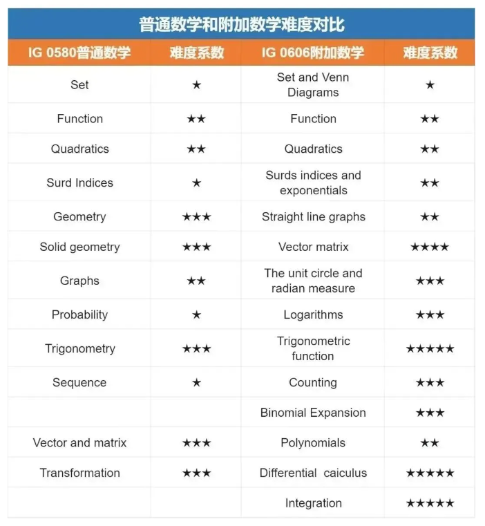 附加数学(IG 0606):集合、函数与二次函数、指数与根式、对数函数及其图像,指数函数及其图像、多项式的计算,弧度制、三角函数及其图像、排列与组合、二项式定理、向量、矩阵、微积分入门。