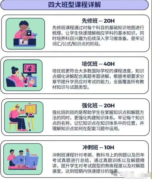培优班更符合大多数国际学校的课程进度,知识点细化讲解配合真题考题讲解,根据考纲要求分章节提升学员应对考试的能力,全面覆盖所有教材知识与试题类型。