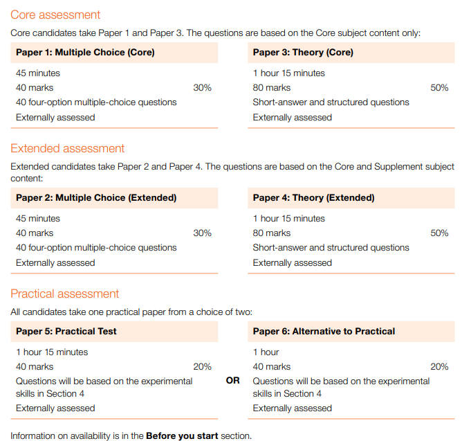 IGCSE物理评估内容包含核心课程评估,拓展课程评估,选择不同课程的同学在选择Paper不同: