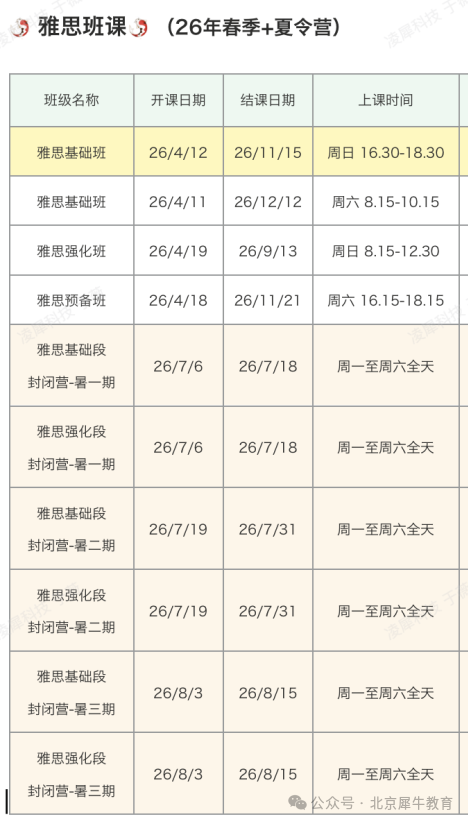 雅思春季班/暑假封闭营班最新班课安排
