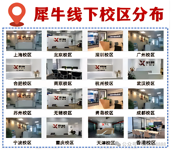 授课便捷:线上线下同步开课犀牛国际教育,线下覆盖北京、上海、广州、深圳、成都等全国 16 城 + 海外校区;线上直播可回放,反复学习直至掌握。