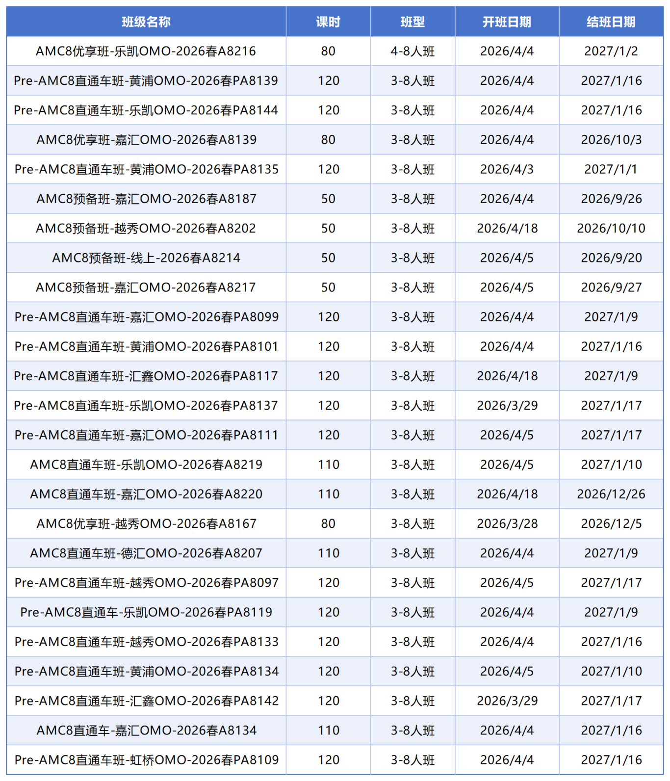 上海黄浦、徐汇、浦东、闵行amc8培训课程新班报名中,全年滚动开班,线上线下随报随学!