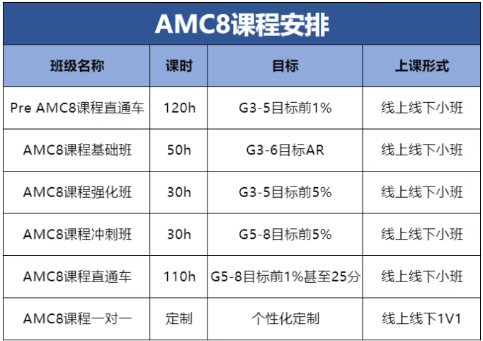开设包括Pre-AMC8直通车、AMC8基础班、强化班、冲刺班、模考班以及全程班等,具体根据前测卷及基础匹配适合班型!