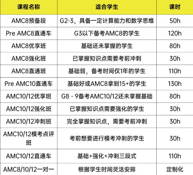 从AMC8基础启蒙到AMC12冲刺晋级,提供预备段、基础班、强化班、冲刺班、直通车班等多元化课程;