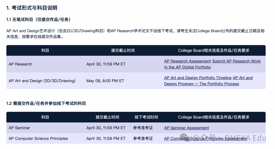 AP Art and Design艺术设计(包含2D/3D/Drawing科目)和AP Research学术论文不设线下考试。请考生关注College Board公布的提交截止日期及相关信息,按要求在线提交作品集。