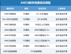 开设的AMC8竞赛课程众多,包含AMC8基础班,AMC8冲刺班,AMC8全程班,AMC8预备班,全球30+校区还有少量名额,欢迎你来了解!AMC8竞赛班
