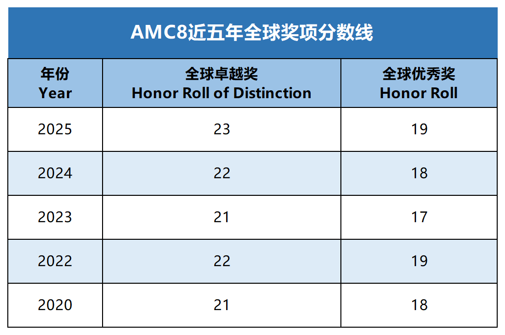 最直观的,我们可以参考下AMC8竞赛历年获奖分数线: