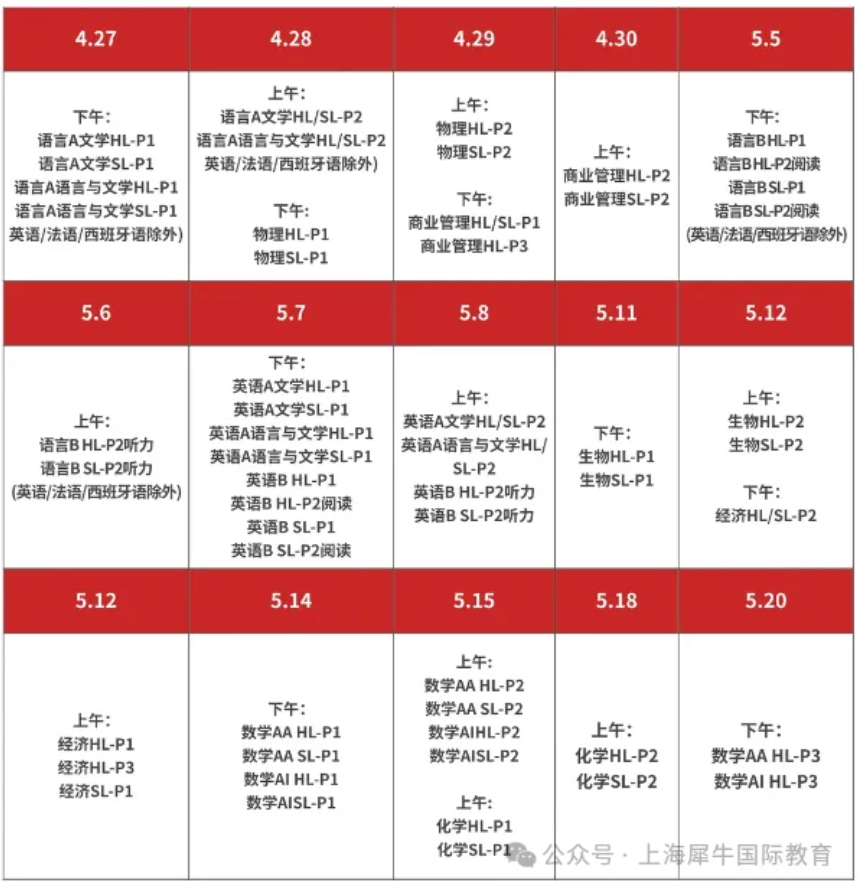 2026年IB大考中国区(A区)考试时间:上午场9:00,下午场:13:00;